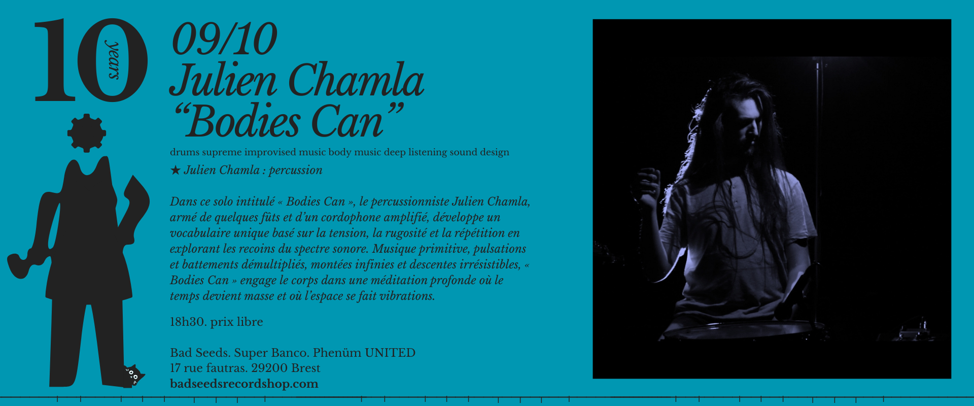 Dans ce solo intitulé « Bodies Can », le percussionniste Julien Chamla, armé de quelques fûts et d’un cordophone amplifié, développe un vocabulaire unique basé sur la tension, la rugosité et la répétition en explorant les recoins du spectre sonore. Musique primitive, pulsations et battements démultipliés, montées infinies et descentes irrésistibles, « Bodies Can » engage le corps dans une méditation profonde où le temps devient masse et où l’espace se fait vibrations.