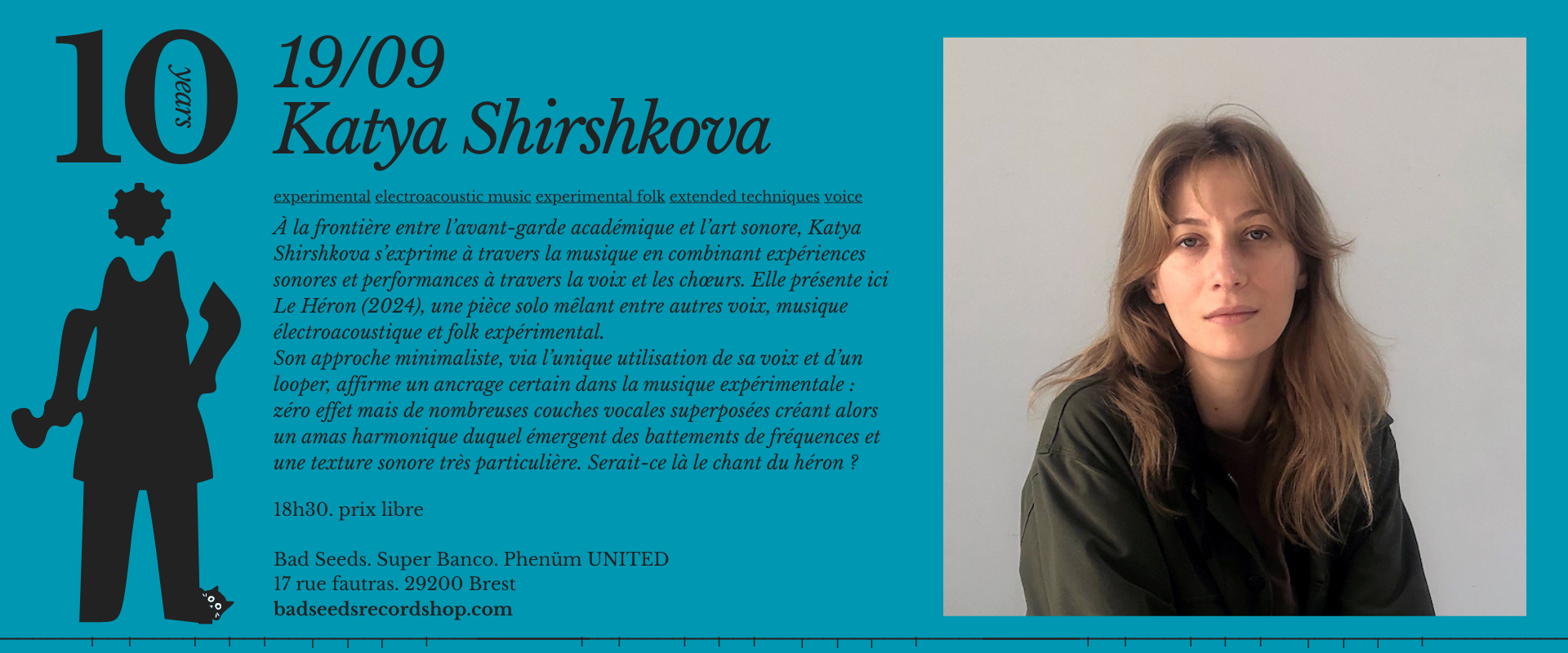 À la frontière entre l’avant-garde académique et l’art sonore, Katya Shirshkova s’exprime à travers la musique en combinant expériences sonores et performances à travers la voix et les chœurs. Elle présente ici Le Héron (2024), une pièce solo mêlant entre autres voix, musique électroacoustique et folk expérimental.